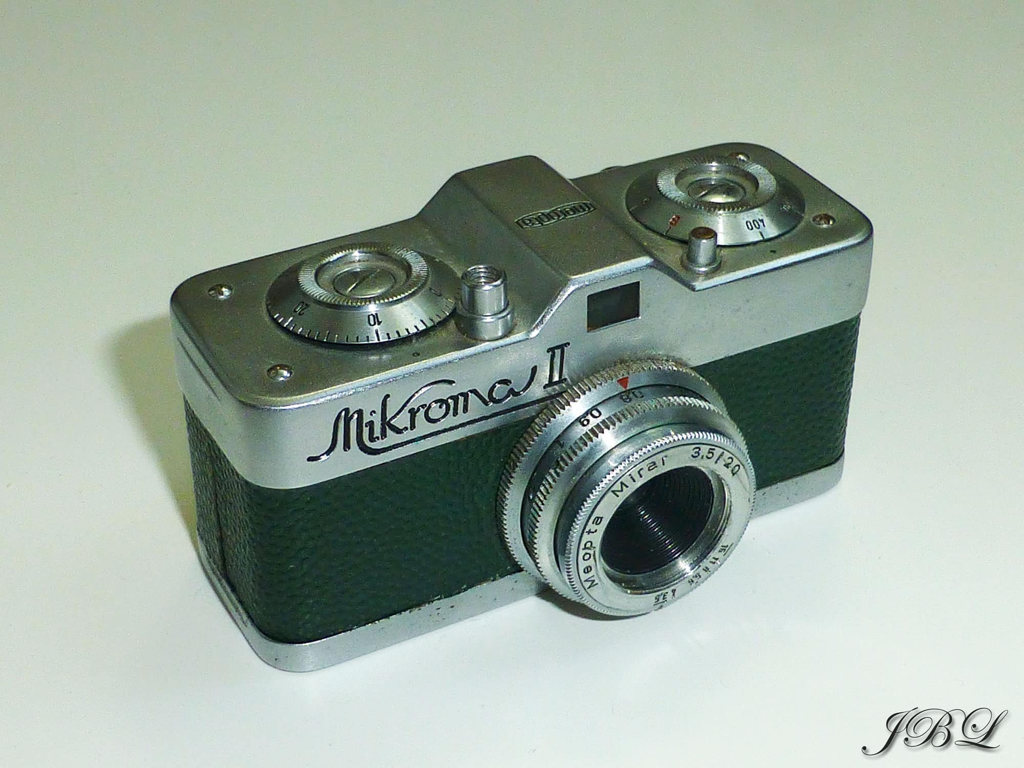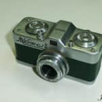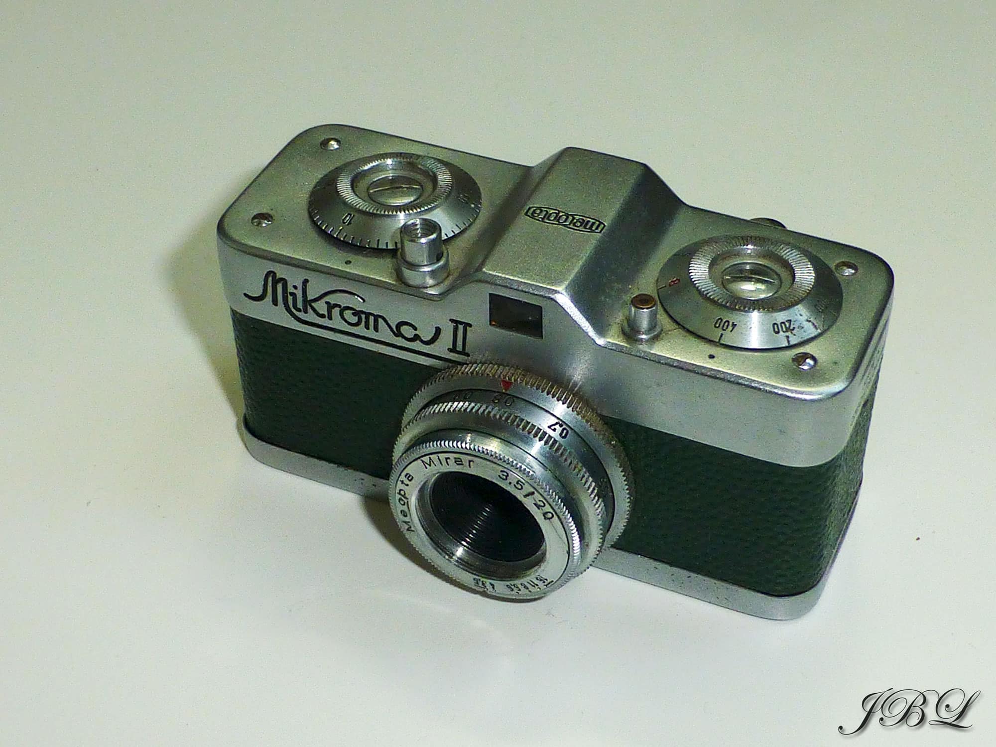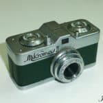 Appareil photographique ancien de collection film 16 mm, de couleur verte, objectif Mirar 3.5f20 mm, modèle Mikroma II vert, de marque Meopta, fabriqué à partir de l’année 1959. Pays d’origine : Tchécoslovaquie.
