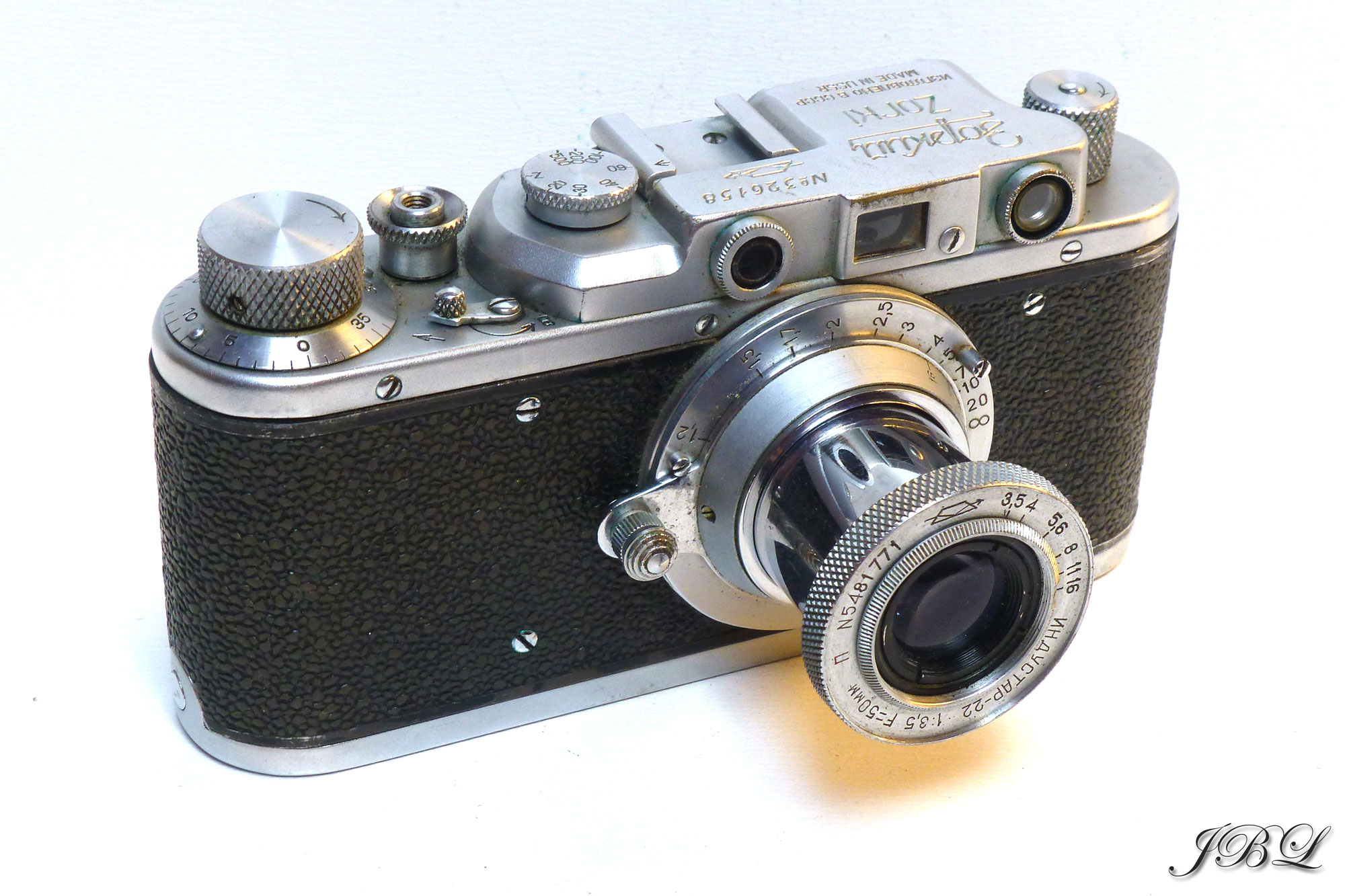 Appareil photographique ancien de collection film 35 mm, modèle Zorki type 1C copie Leica II, de marque Krasnogorsk, objectif 3.5f50, fabriqué à partir de l’année 1951. Pays d’origine : Russie.