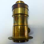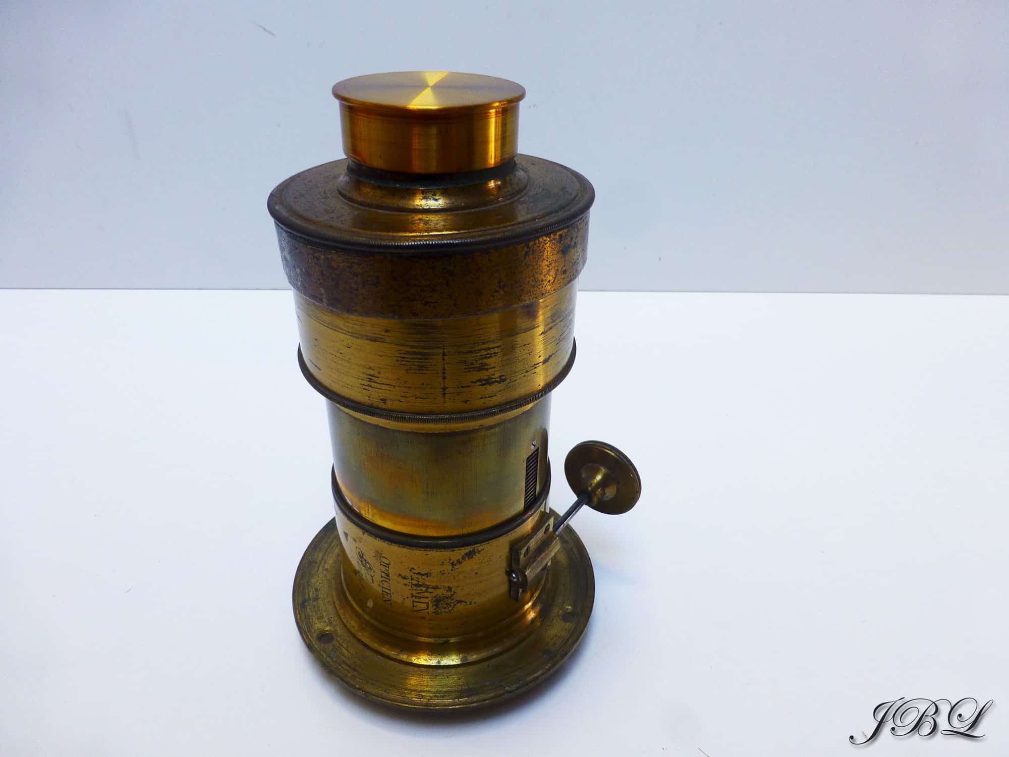 Objectif en laiton,  hauteur 16cm, diamètre 7,8 cm (paresoleil), 6cm (lentille), diamètre bague 11cm, focale environ 18cm, pas de No , de marque JAMIN opticien Paris, fabriqué à partir de l’année 1860 . Pays d’origine : France.